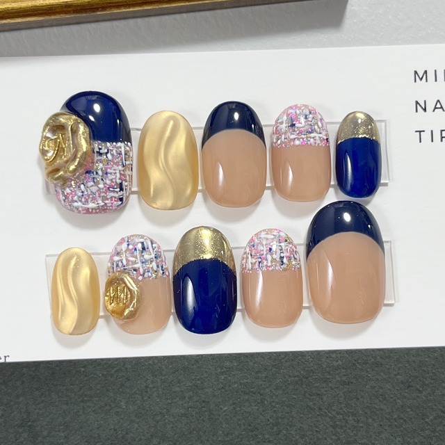 【528】ネイルチップ現品 Mサイズ ツイードネイル ご購入前に必ず【information】をご一読ください サイズ ┊ М(1.4.3.4.8) チップの種類 ┊ ショートオーバル ・ネイビーのツイードでハーフフレンチ 10本凹凸なくつるんと仕上げました ・ベースカラーはマロン色です 【内容】 ・ネイルチップ 両手分のみ ※セール品のため、 装着方法の紙,チップ用粘着テープ,ネイルファイル,ウッドスティックは付属しておりません ※セール用の包装となります 【サイズについて】 チップサイズ・種類は写真後半でご確認ください セール商品のご購入後のキャンセル、返品、交換等は対応いたしかねます 【送料・発送方法】 全国一律290円 ヤマト運輸ネコポス(追跡サービスあり) 郵便受けに投函されます ・お支払い確定後、翌日~1週間以内に発送致します ※ご注文が混み合っている場合は通常よりお時間をいただくことがございます ※お使いのパソコンやスマホ環境により 写真と実物の色が異なって見える場合があります 予めご了承ください *─────────────* お問い合わせ・ご質問は InstagramのDMまたは BASEのショップページ内のお問い合わせから お気軽にどうぞ *─────────────*