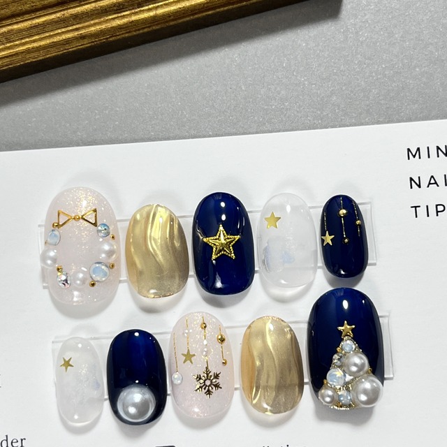 【538】ネイルチップ 現品 サイズM ツイードクリスマスツリー ご購入前に必ず【information】をご一読ください サイズ ┊ М(1.4.3.4.8) チップの種類 ┊ ショートオーバル ・ゴールド×ベージュホワイトをベースに 当サロンのクリスマスネイルで人気No.1の、 ツイードクリスマスツリー ・ホワイトはモヤモヤネイルになっています 【内容】 ・ネイルチップ 両手分のみ ※セール品のため、 装着方法の紙,チップ用粘着テープ,ネイルファイル,ウッドスティックは付属しておりません ※セール用の包装となります 【サイズについて】 チップサイズ・種類は写真後半でご確認ください セール商品のご購入後のキャンセル、返品、交換等は対応いたしかねます 【送料・発送方法】 全国一律290円 ヤマト運輸ネコポス(追跡サービスあり) 郵便受けに投函されます ・お支払い確定後、翌日~1週間以内に発送致します ※ご注文が混み合っている場合は通常よりお時間をいただくことがございます ※お使いのパソコンやスマホ環境により 写真と実物の色が異なって見える場合があります 予めご了承ください *─────────────* お問い合わせ・ご質問は InstagramのDMまたは BASEのショップページ内のお問い合わせから お気軽にどうぞ *─────────────*