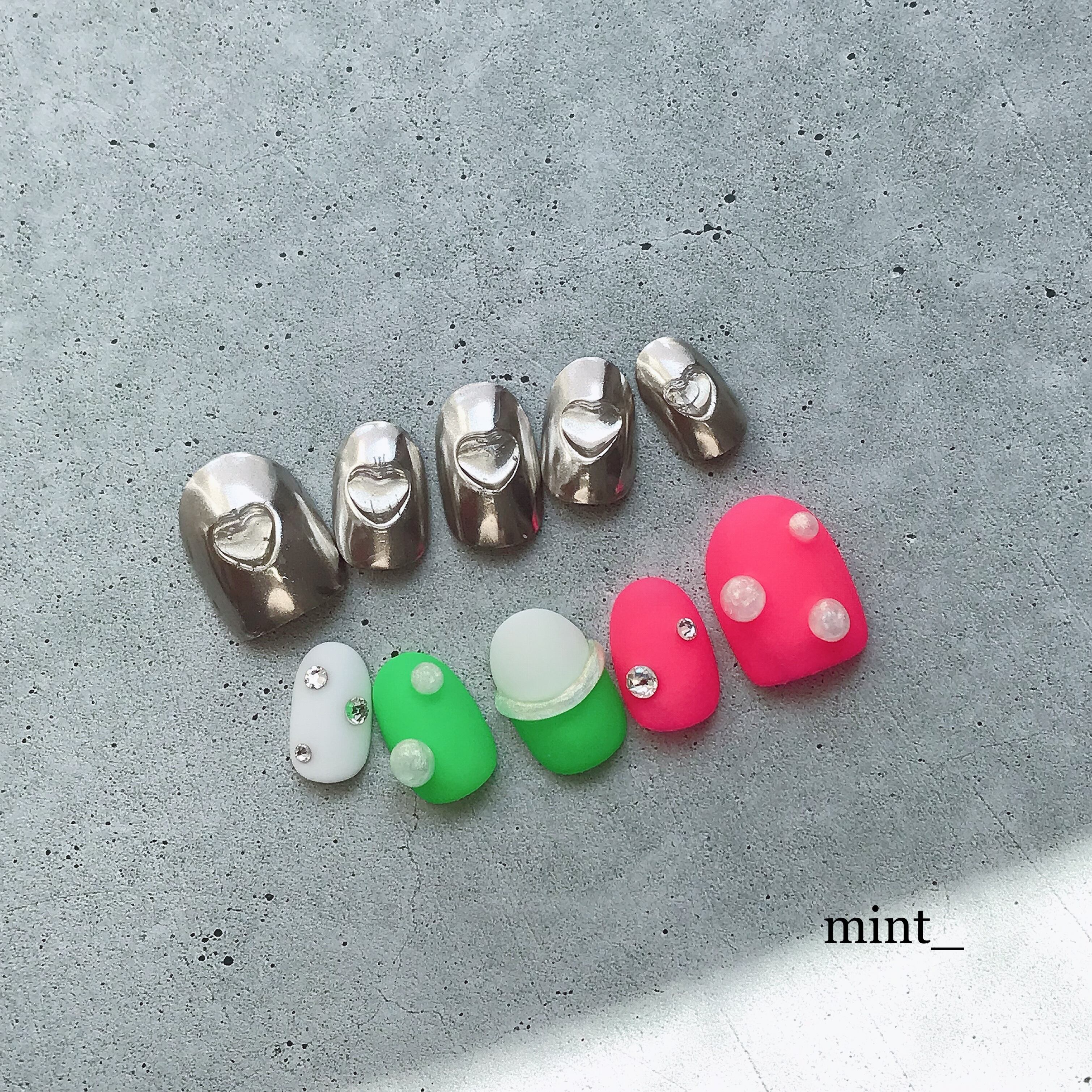 ネオンカラーのパートが可愛すぎて、それをメインに、片手はミラーネイルにハートの立体の